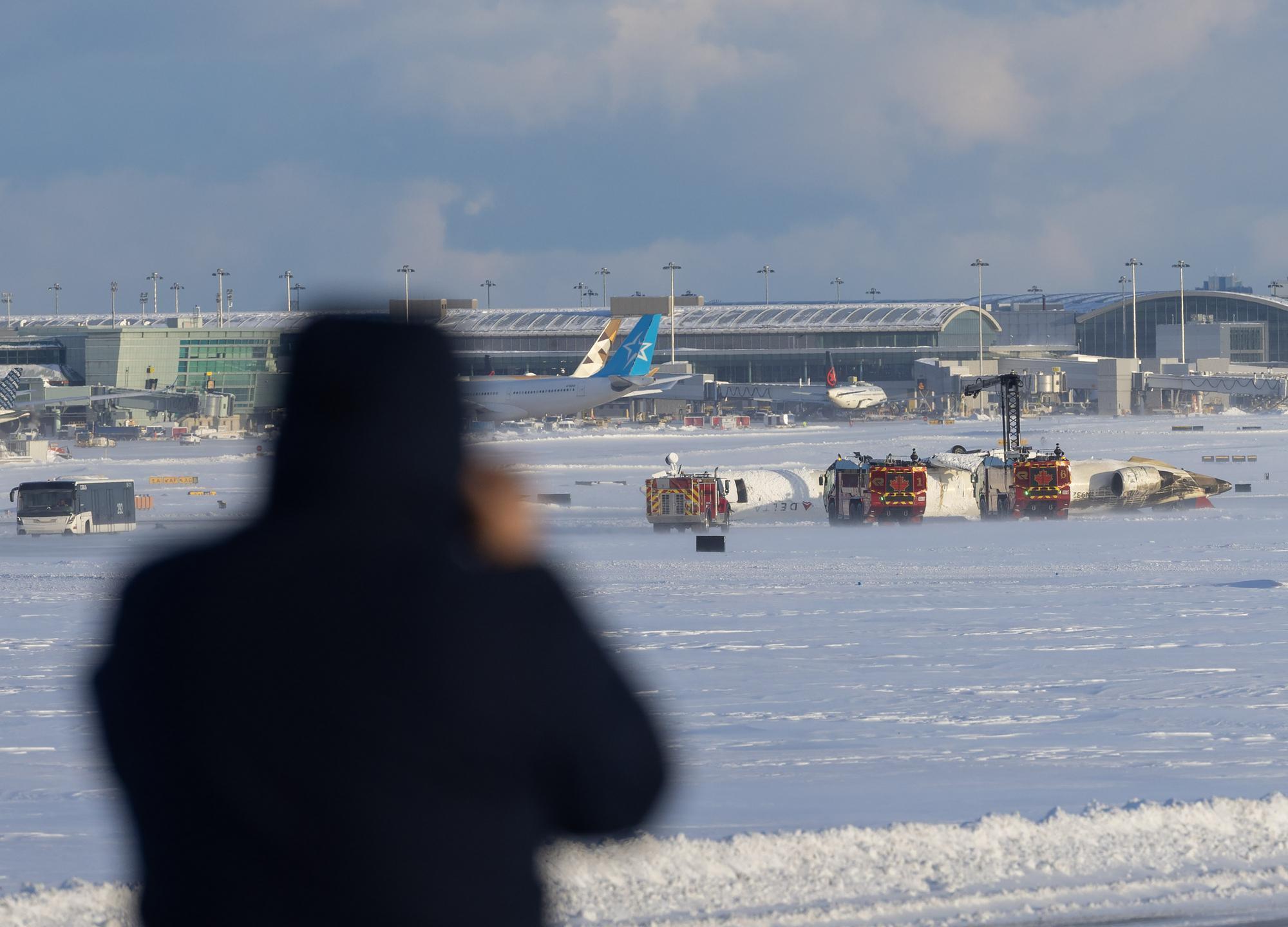 2月17日,在加拿大多伦多皮尔逊国际机场,一架客机倒翻在跑道上。新华社发(邹峥摄)前空乘人员简·布朗说:“最可悲的是,当家长们把儿童抱坐膝上乘机,其中多数家长还以为既然这种做法(被航空公司)允许,那么肯定安全。”